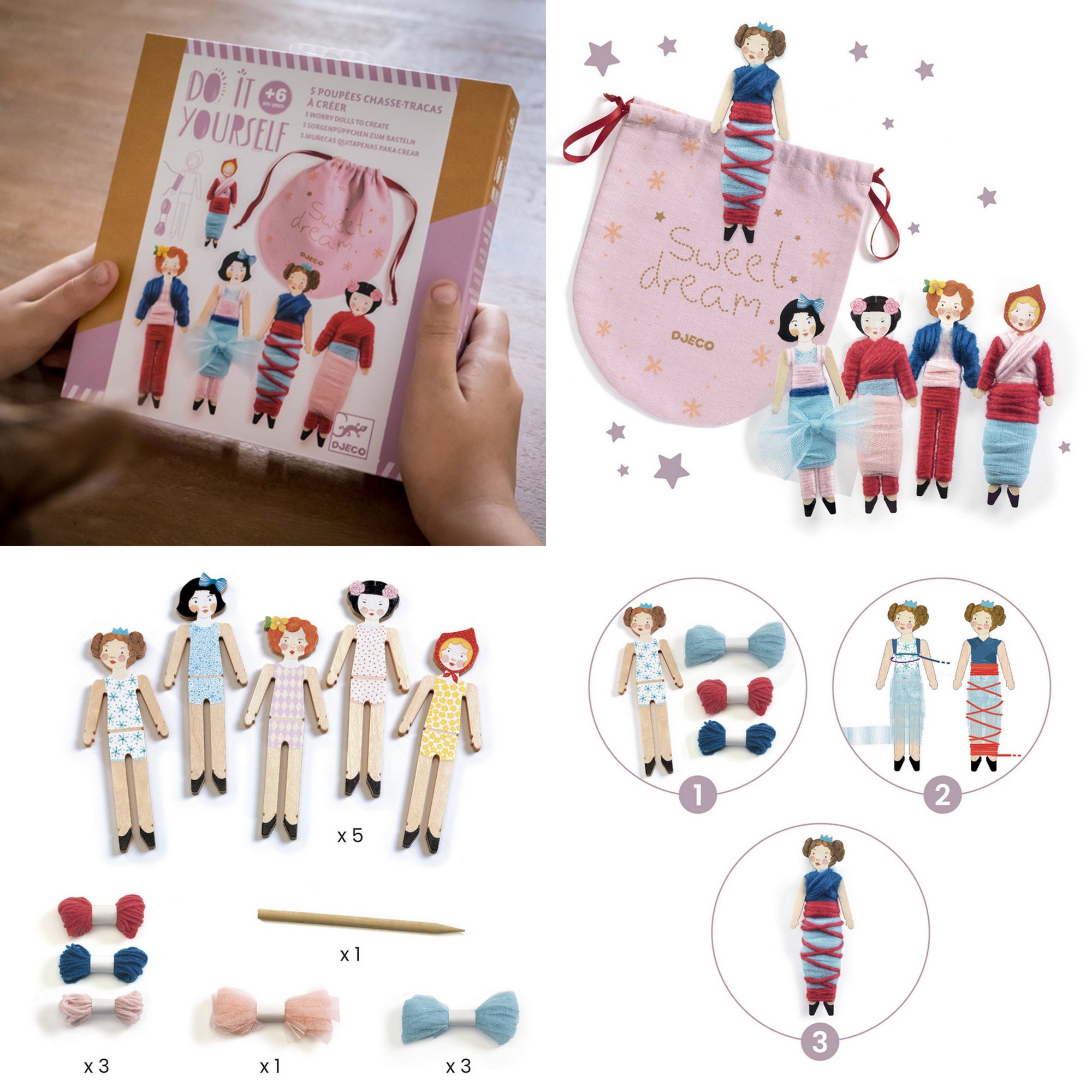 Tell all your worries to these adorable dolls. This Djeco Sweet Night Worry Dolls set includes 5 dolls to create: dress the little dolls by wrapping them in the yarn and coloured tulle provided in the kit. Once the dolls are dressed, children can trust them with their troubles and slip them under their pillow using the pretty pouch provided.