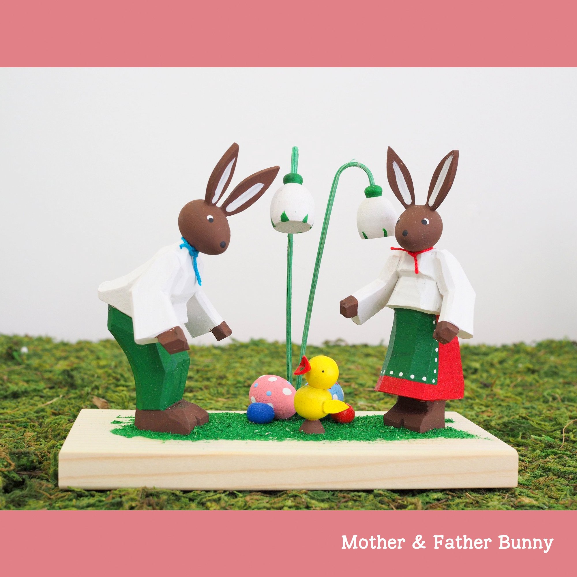 These beautiful Easter themed Bunnies have been handcrafted in a tiny village in the Erzgebirge mountains in Germany, by Bettina the sixth generation of her family to work as a master in woodcraft.