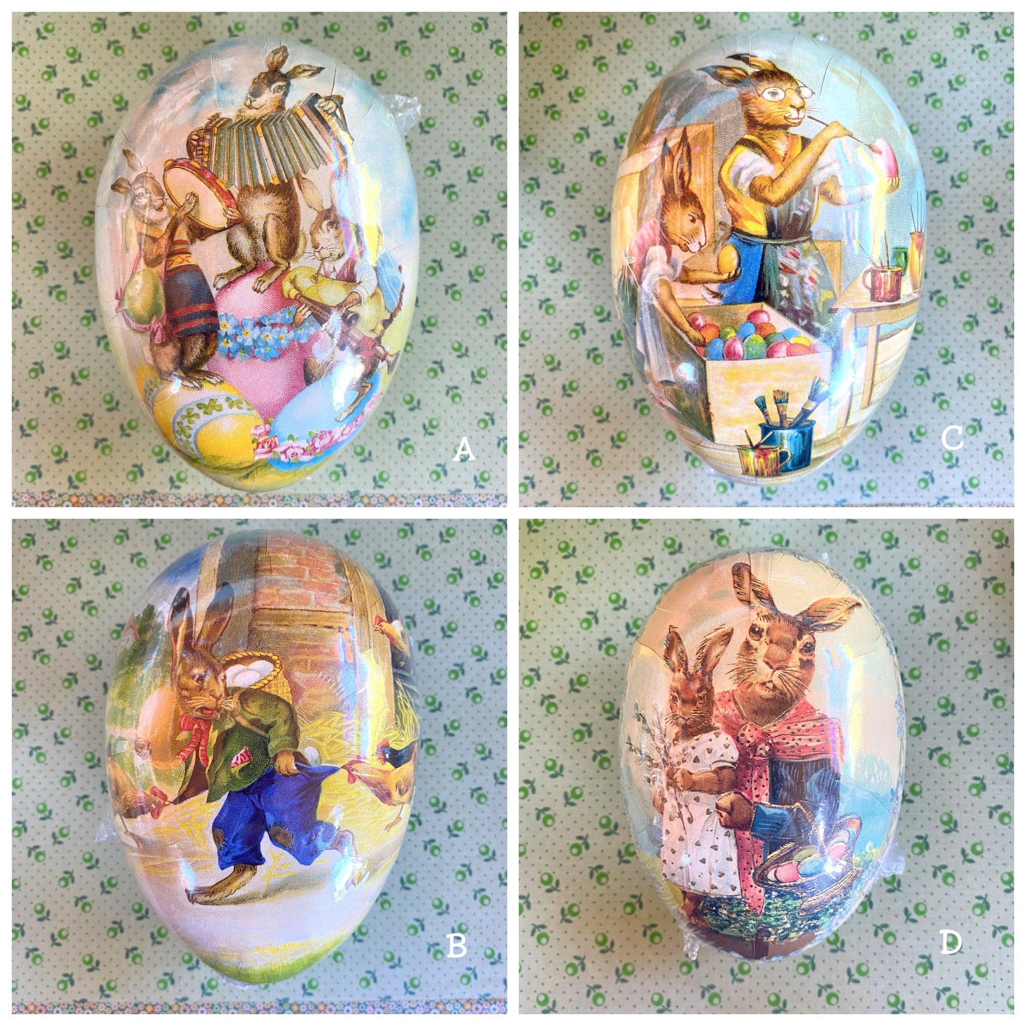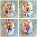 The German Osterhase or Easter Bunny doesn’t hide treats in colourful plastic eggs in Germany, instead he uses traditional Pappmaché Ostereier or German Paper Mache Easter Eggs. Always beautifully decorated, they feature designs like bunnies, flowers or springtime motifs and come in a large or medium size, just perfect for filling with chocolate. The Easter eggs are made of fine cardboard, so please do not lay them in wet grass! Handcrafted in Germany.