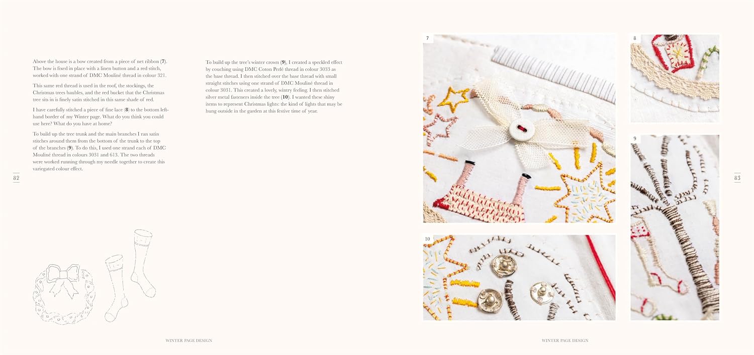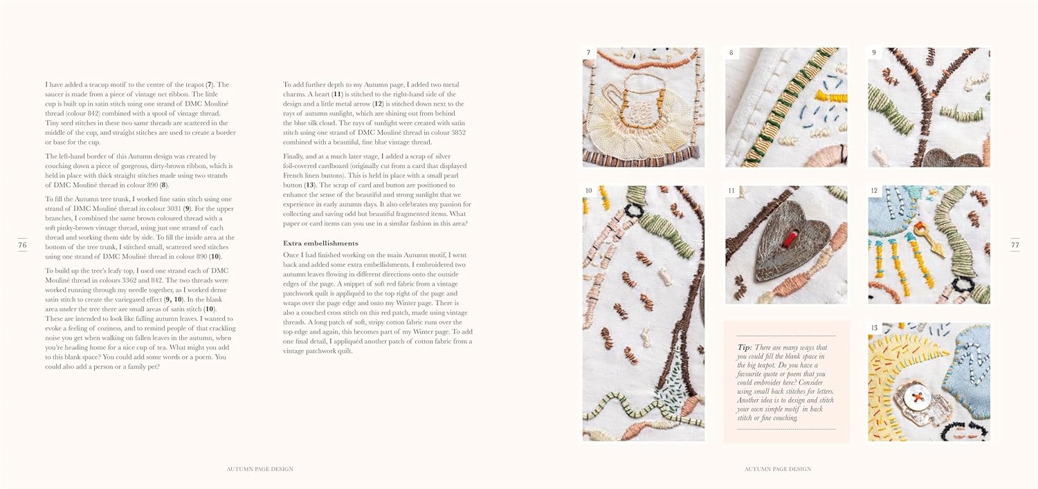 The central theme of the project is the four seasons: Spring, Summer, Autumn and Winter, and there are four seasonal hand drawn motifs on iron-on transfer paper that can be used as the basis of the designs. The four seasonal motifs are accompanied by four further motifs which are intended for the inside and outside covers. Jessie then explains how to fill in and embellish these designs using a variety of her favourite stitches, threads, special notions, treasures, and keepsakes.