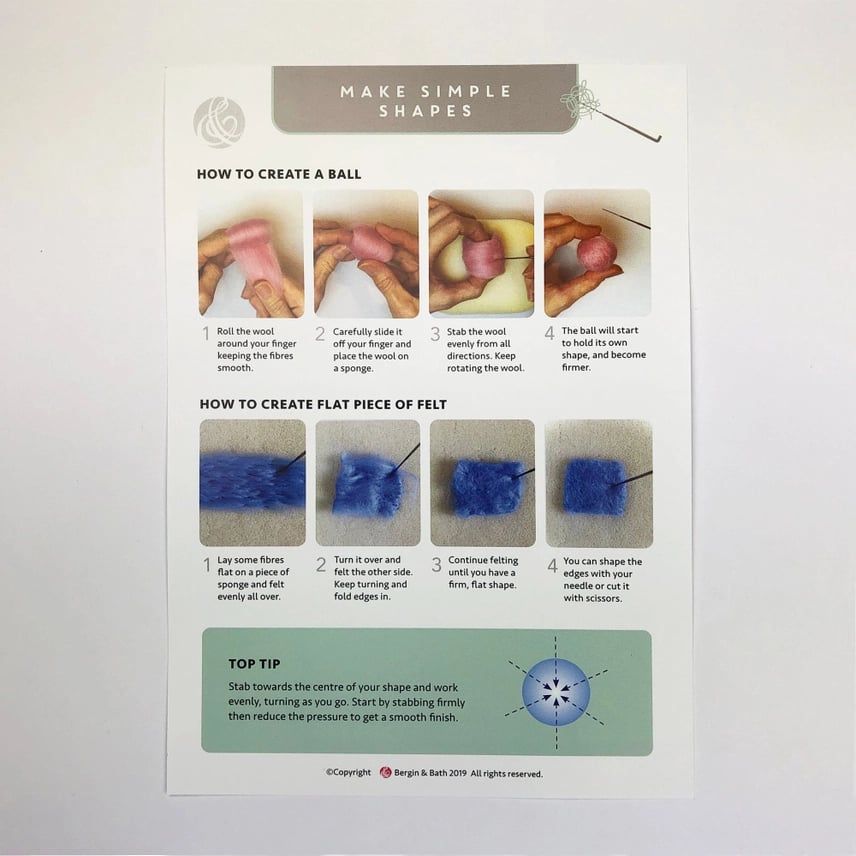 Carefully packaged inside the pretty display box, you will find 70g of beautiful bright merino wool colours: gooseberry, yellow, red, green, elderberry, purple, cerulean and rose; TWO specialist 40-gauge triangular-tipped needles and a needle-felting basics guide to help you get started.