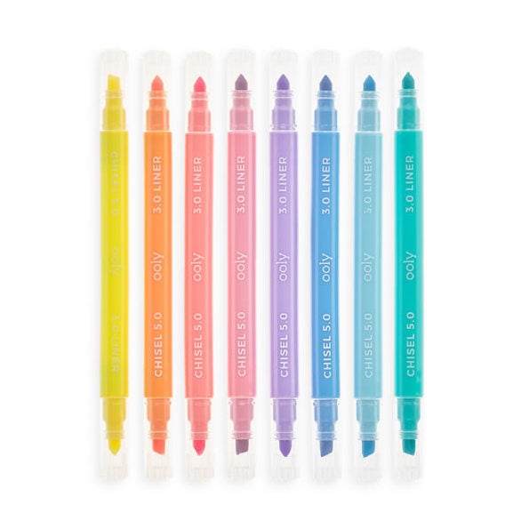 Draw and highlight with beautifully bright pastel colours with the Pastel Liners marker set. Pastel Liners are a set of 8 pastel markers with dual tips. One side is a 5mm chisel tip so you can use it as a pastel highlighter pen the other is a 3 mm fine tip marker that you can use to sketch, colour, draw and write in beautiful pastel colours.