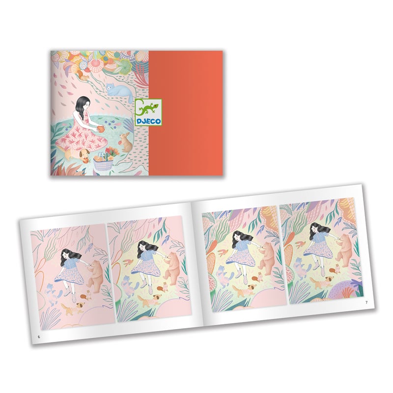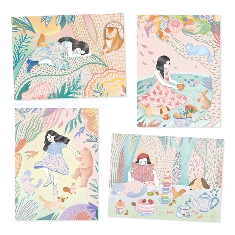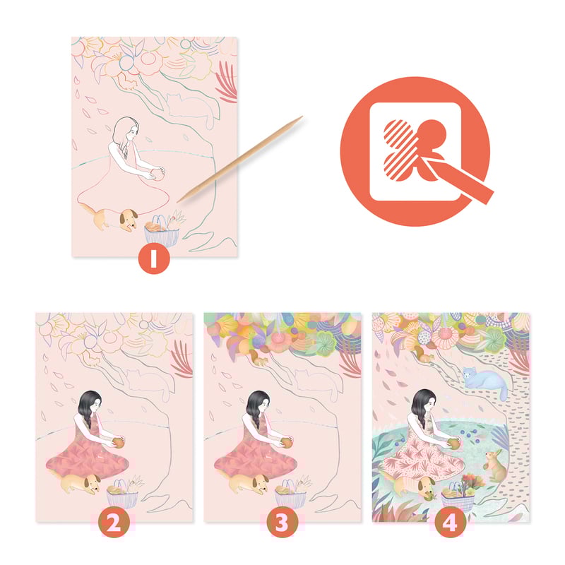 Gorgeous fantasy scenes with a girl on a picnic come to life with beautiful patterns as the design is scratched away. Scratch the cards with the provided tool to reveal the surprise pictures. Packs include 4 cards and the wooden scratch tool.