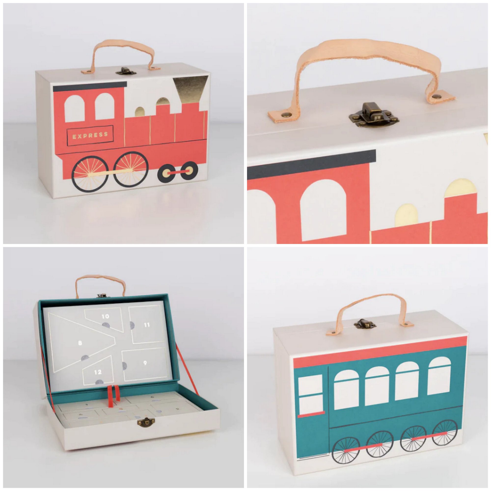 - Comes in a wrapped cardboard mini suitcase with a train design with gold foil details.